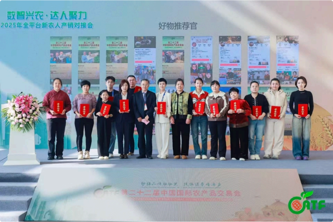 10⽉18⽇,作为第⼆⼗⼆届中国国际农产品交易会(农交会)同期活动,“数智兴农·达⼈聚⼒”2025全平台新农⼈产销对接会在农交会成功举办。本次活动由全国农业展览馆主办、北京农展国际传媒有限公司承办,汇聚快⼿、京东、抖⾳、本来⽣活、⾸衡集团等头部平台与企业代表、三农达⼈及产销嘉宾近百⼈,深度探索数字时代农业产销融合新路径。