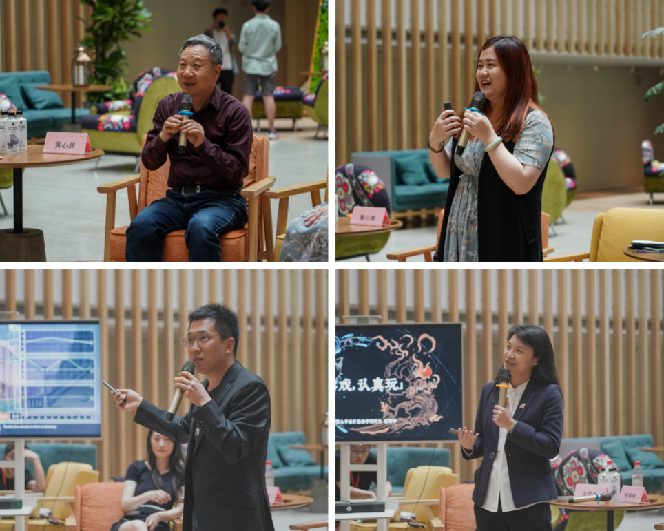 中国传媒大学动画与数字艺术学院院长黄心渊、游戏系系主任张兆弓、中国传媒大学设计思维学院院长税琳琳、英雄体育VSPN高级制作人张雨晨在现场进行分享