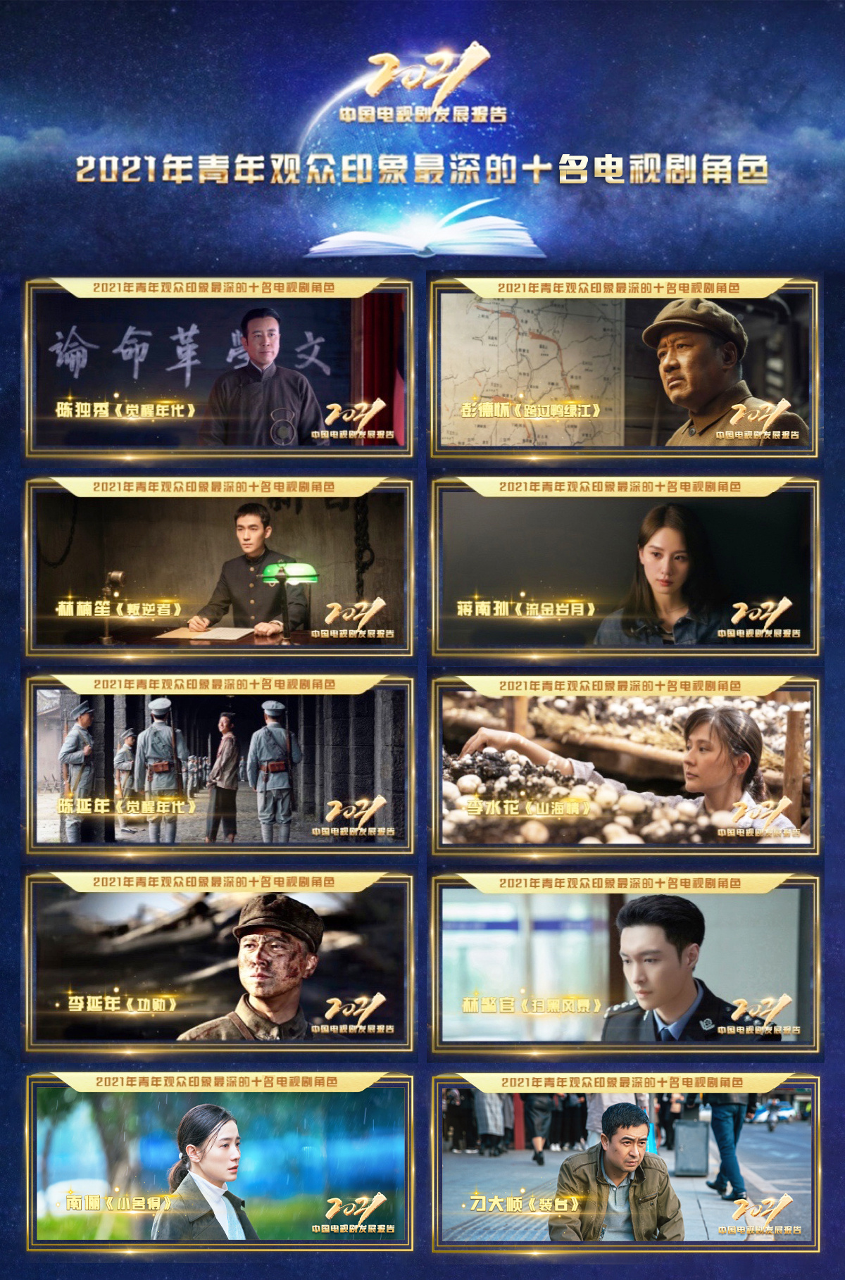 2021年青年观众印象最深的十名电视剧角色是:陈独秀(《觉醒年代》)、彭德怀(《跨过鸭绿江》)、林楠笙(《叛逆者》)、蒋南孙(《流金岁月》)、陈延年(《觉醒年代》)、李水花(《山海情》)、李延年(《功勋》)、林警官(《扫黑风暴》)、南俪(《小舍得》)、刁大顺(《装台》)。