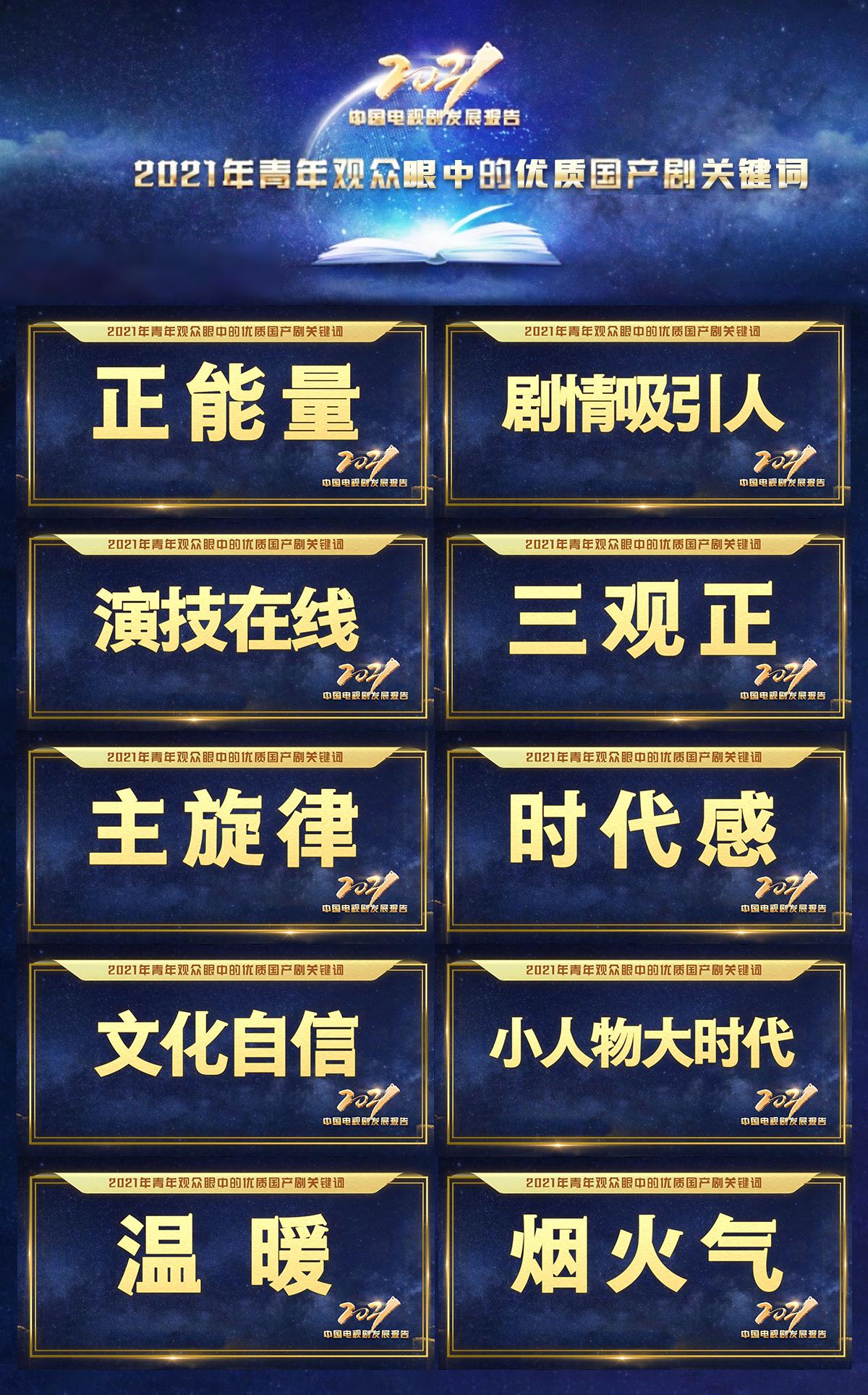 2021年青年观众眼中的优质国产剧关键词是:正能量、剧情吸引人、演技在线、三观正、主旋律、时代感、文化自信、小人物大时代、温暖、烟火气等。