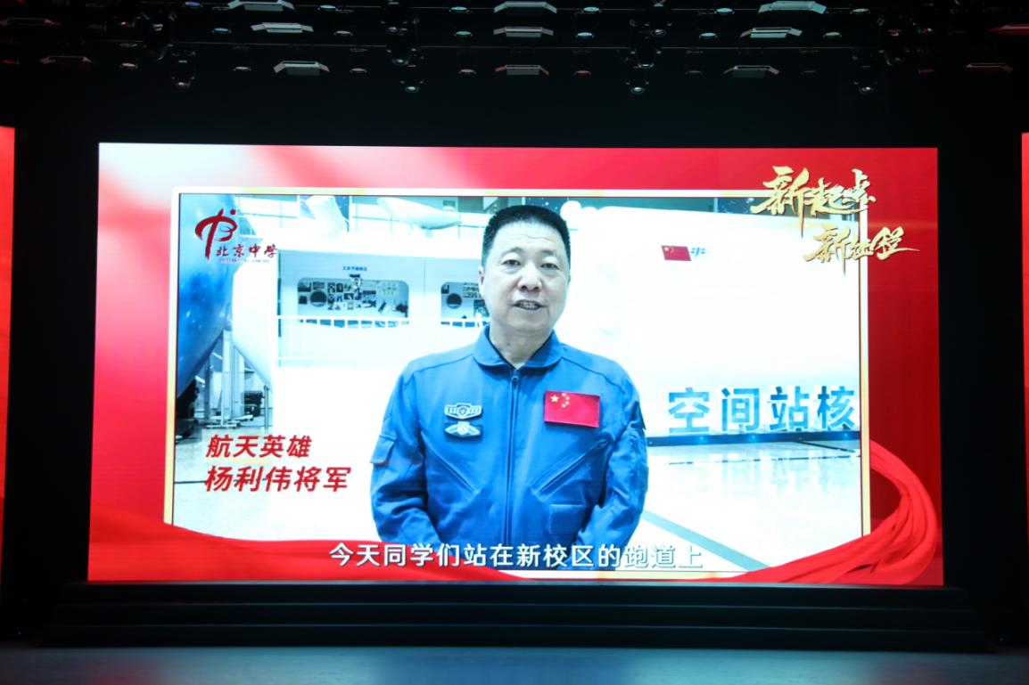航天英雄杨利伟将军通过视频的方式为北京中学送来祝福。杨将军的话语中饱含对同学们的殷切期望,他鼓励同学们树立远大理想,勇于探索未知,在学习中不断提升自己的科学素养和综合能力,为实现中华民族伟大复兴的中国梦贡献自己的力量。